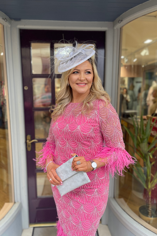 Gill Harvey 8008 Mid Length Beaded Feather Dress Pink