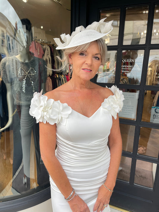 Anoola D462 Ivory & Sand Embossed Off Shoulder Neckine Dress