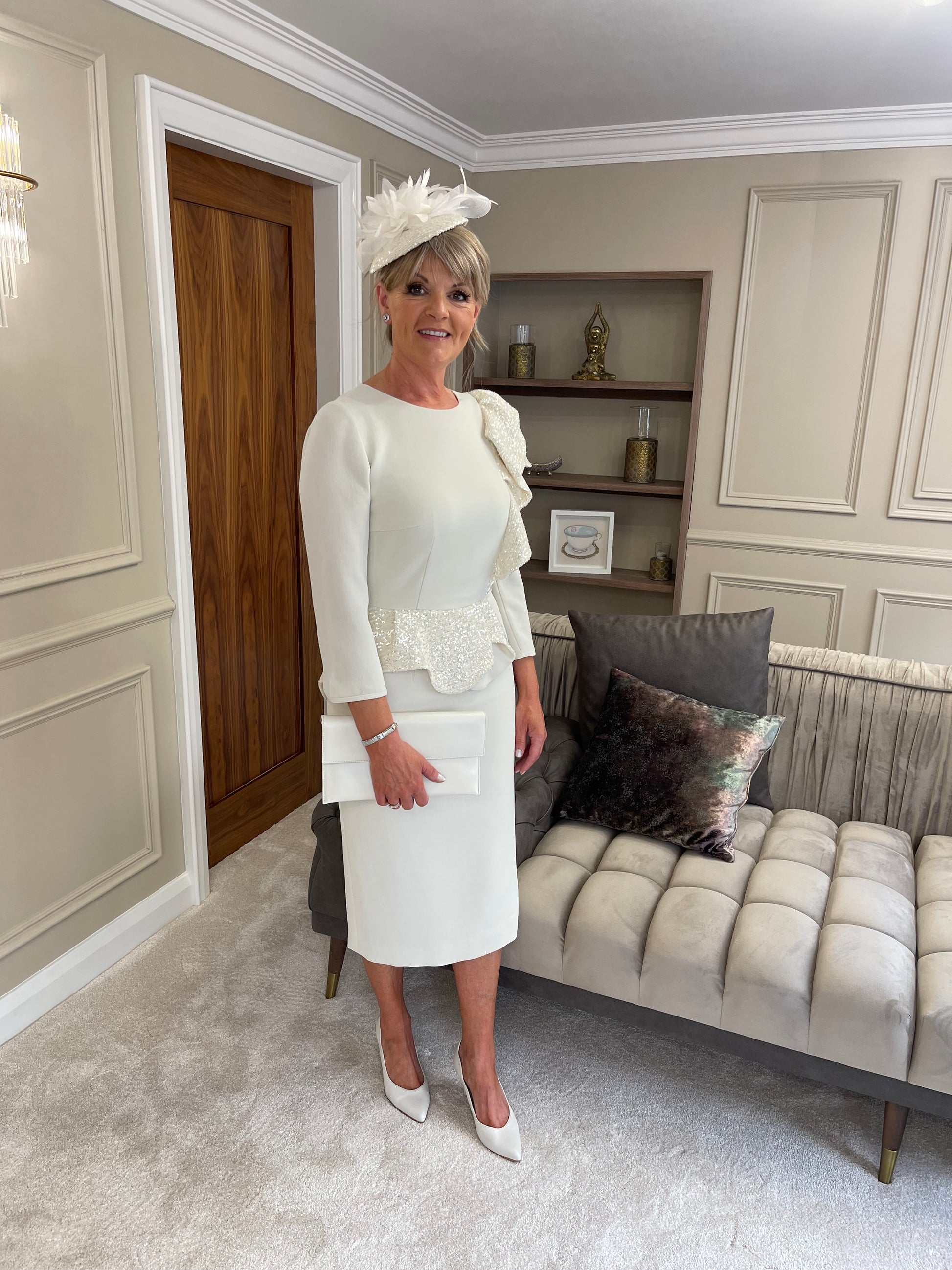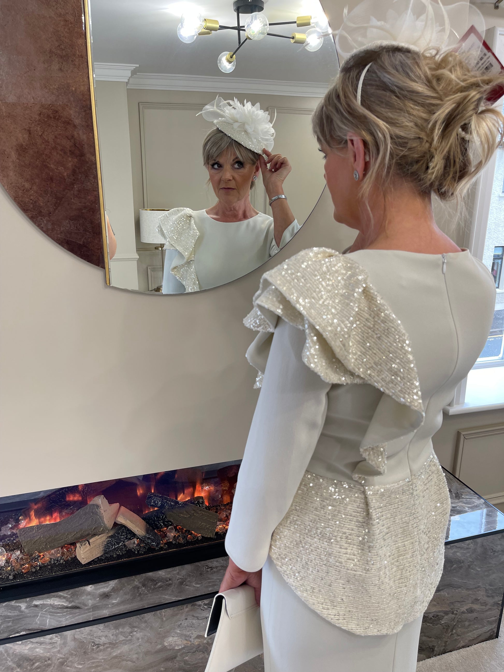 Ivory Carmen Melero dress with gold shimmer ruffling on the shoulder and a waterfall hem.