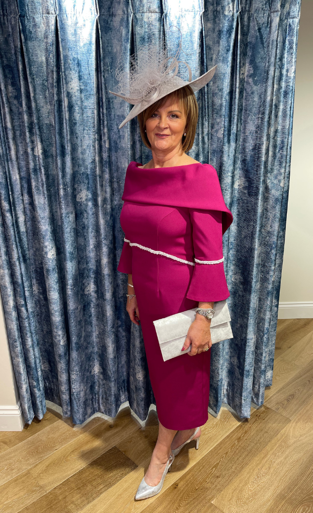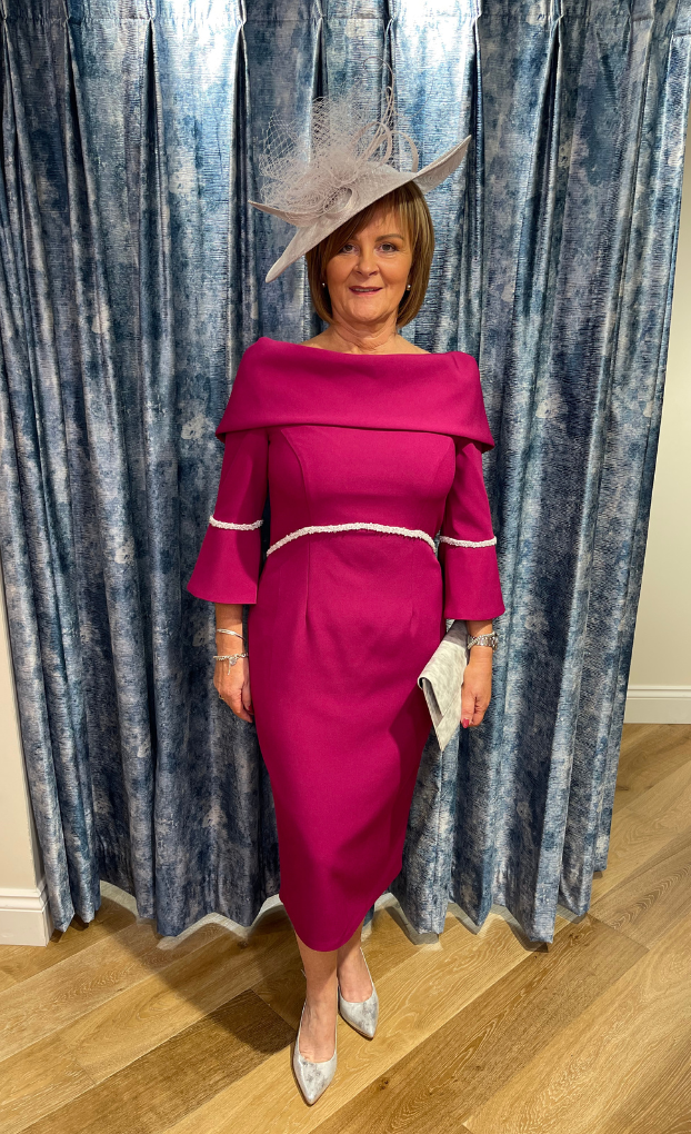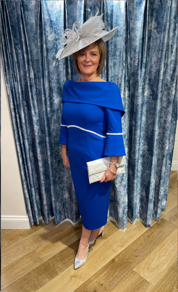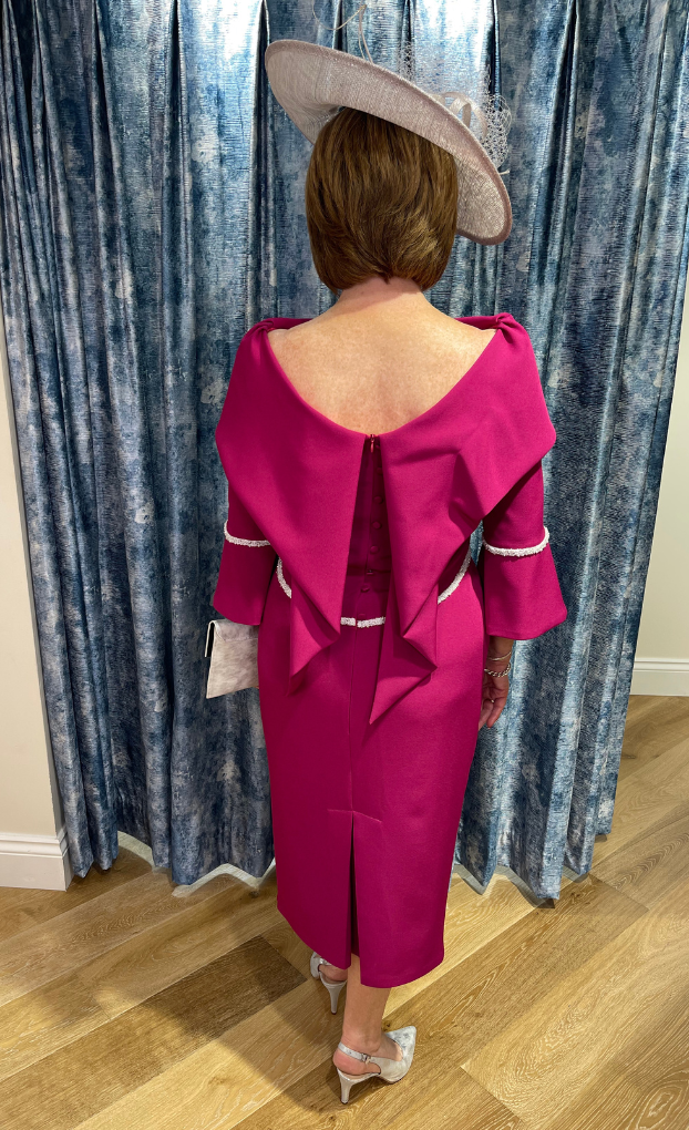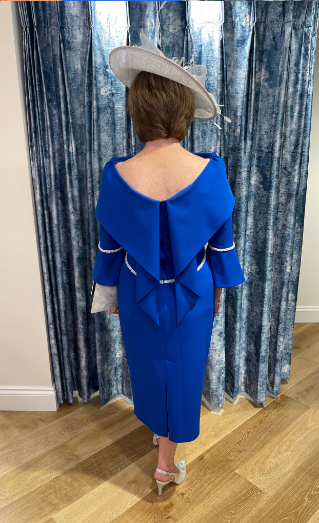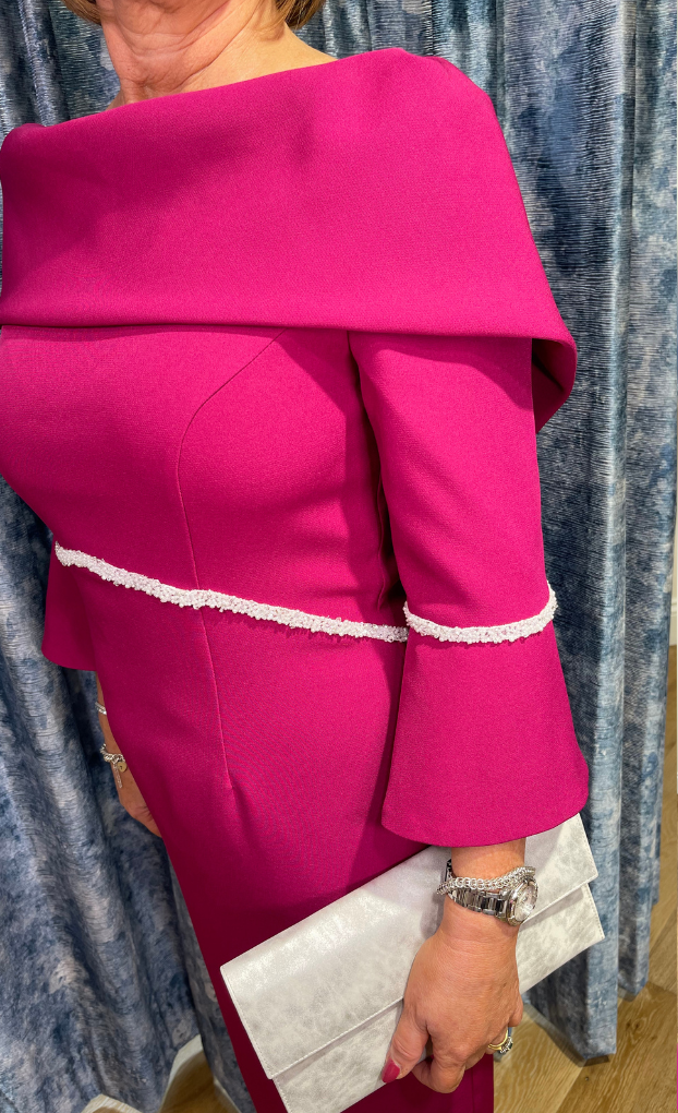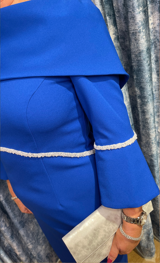 Gorgeous Column Dress with Cowl Neckline, 3/4 Length flared duff sleeves, beautifully finished in diamante detail around waistline and cuff edges.