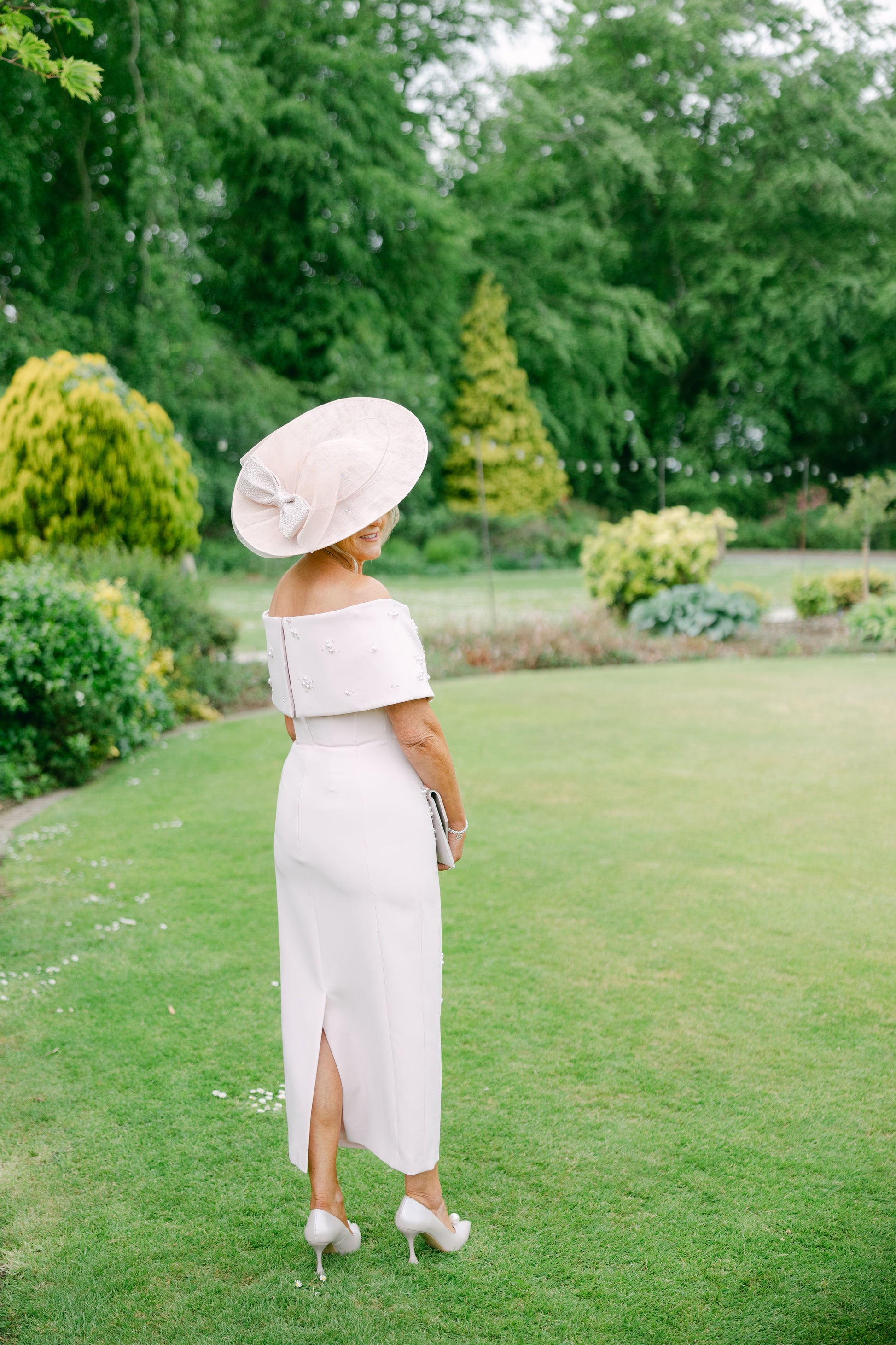 A stunning Bardot neckline dress from the John Charles latest collection with the most stunning pearls delicately placed over the body of the dress. A fitted shape which is so flattering and easy to wear. The rose pink colour is soft and suitable for a pastel colour pallet for a wedding.