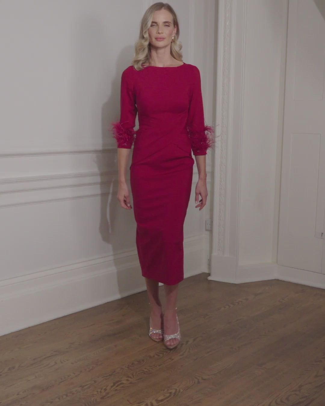 What a stunning dress from the Autumn Winter John Charles Collection. Offering a round neckline and 3/4 sleeve with a beaded and feather detail on the sleeve. The fitted shape and ruched waist really is truly flattering on a figure showing of curves to their potential. The dress is a stunning shape with a back zip closure and ruching also continues around the back of the dress also. The feathers on the sleeve offer that little touch of drama to an elegant dress which screams class for a Mother of the Bride or Groom.