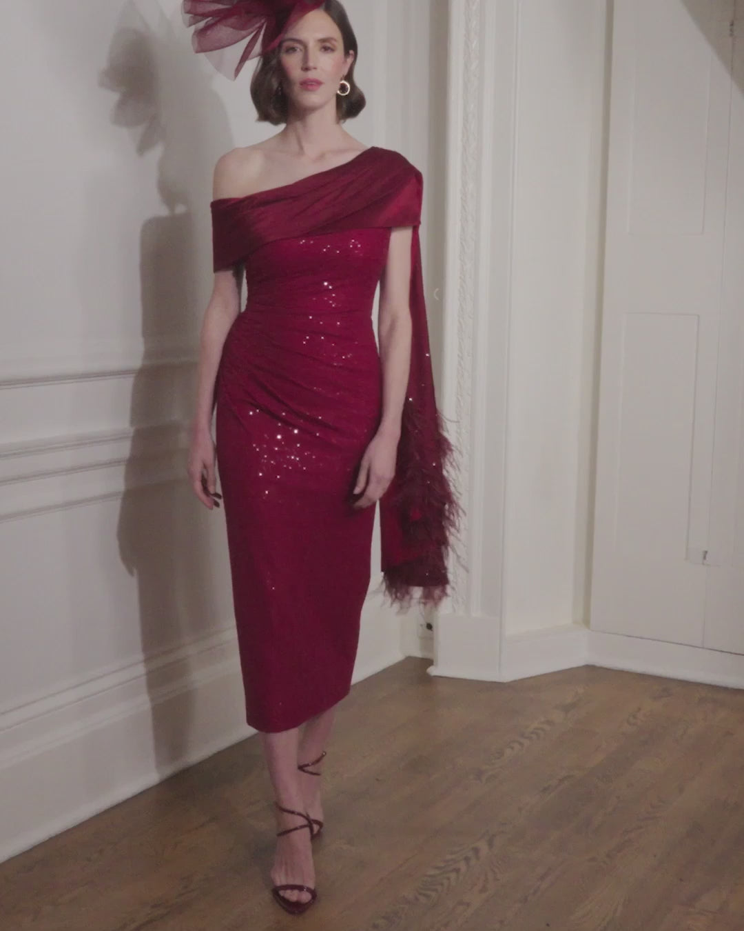 John Charles have really excelled with this amazing design. Style 29282 is a statement eye catching Mother of the Bride outfit. Featuring a drape on one shoulder for extra drama and one shoulder detail. A satin ruched bodice and a stretch beaded skirt in a fitted shape which accentuates curves. Zip closure on back and available in several colours. Dress 29282 in Bordeaux colour is a must to try on for a special event such as a son or daughter’s wedding.