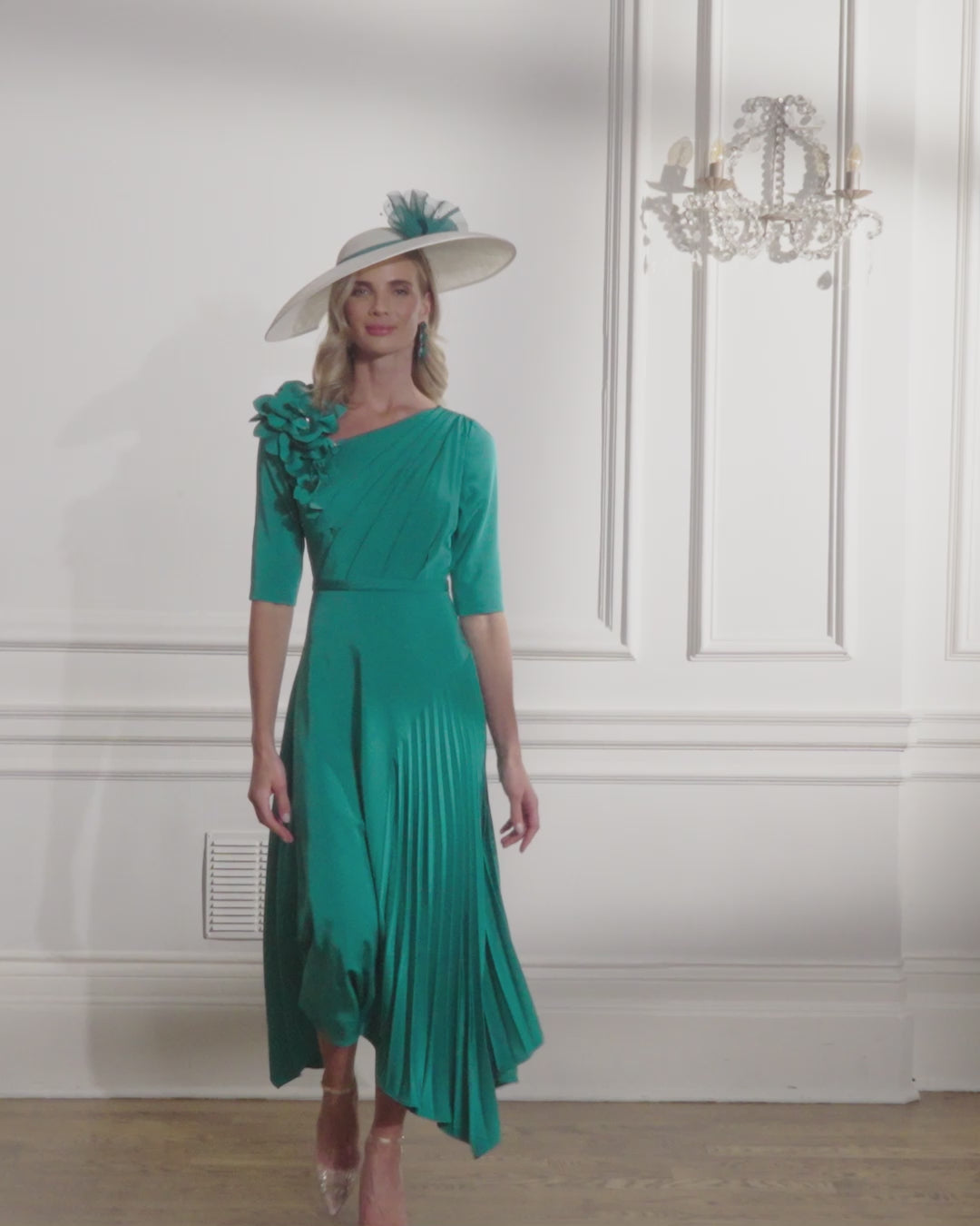 Featuring a stunning new design from the John Charles Autumn Winter Collection in a fabulous forest green colour. The dress has a 3/4 sleeve, asymmetrical neckline with a floral applique on the neck. A signature A-Line skirt with a pleated side to add that little extra detailing. An amazing crepe fabric, light weight and stunning movement to the skirt. Zip closure. Style number 66684.