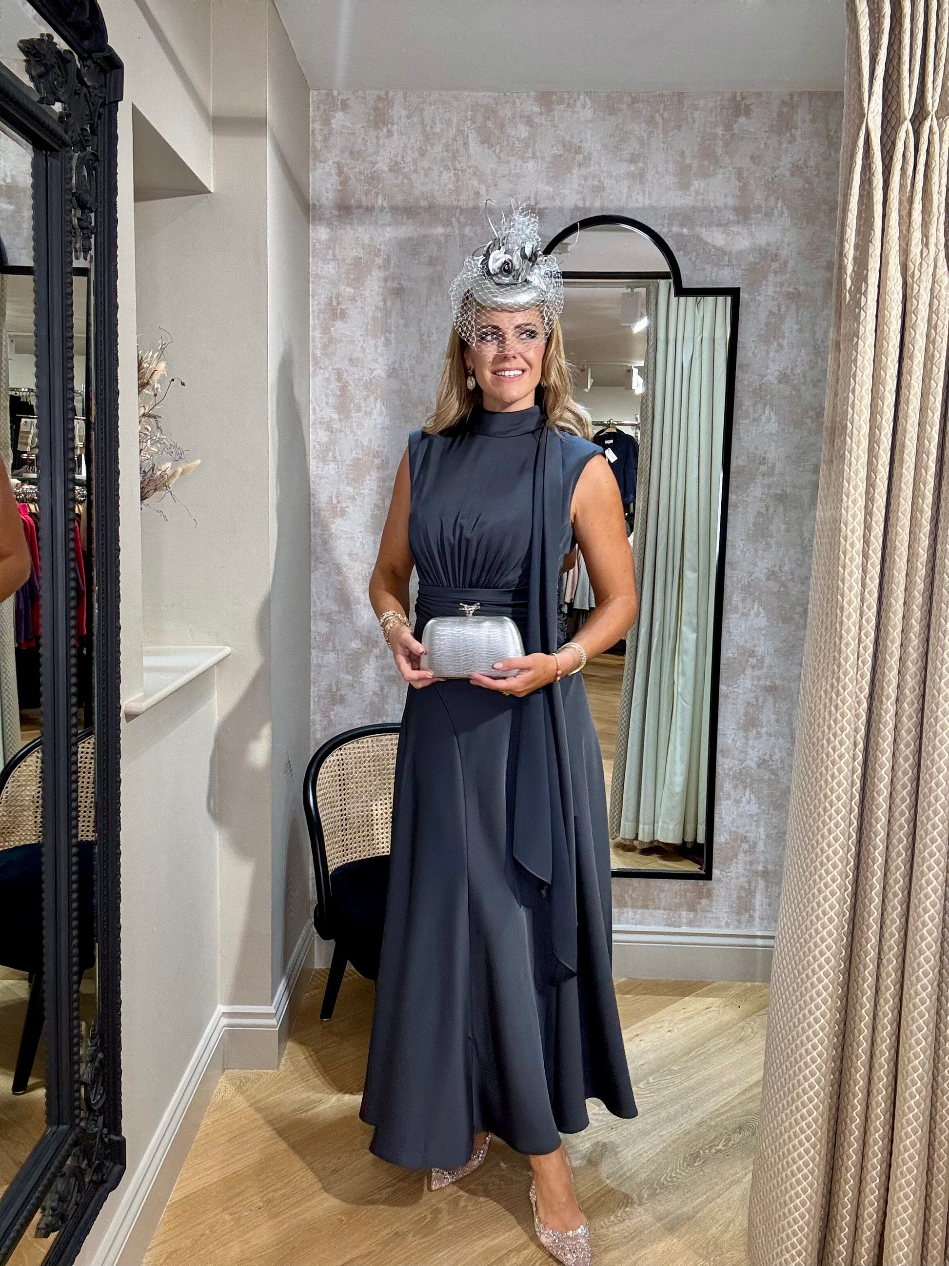 Introducing the exquisite Maisonel charcoal satin dress. With a high neckline and drape satin detail, this dress is perfect for wedding guests. The elegant, charcoal colour adds sophistication, making you stand out in the crowd. Stay stylish and comfortable at any special event with Maisonel.