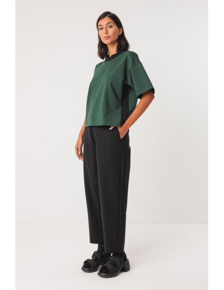 Discover the vibrant charm of the SKFK Ahatsa Dark Green T-Shirt! This short, loose-fitting top features a stylish round neckline with a contrasting band, adding a fresh twist to a classic design. Its relaxed cut ensures all-day comfort while making a bold fashion statement. Add this unique and lively piece to your collection for a perfect blend of comfort and eye-catching style!