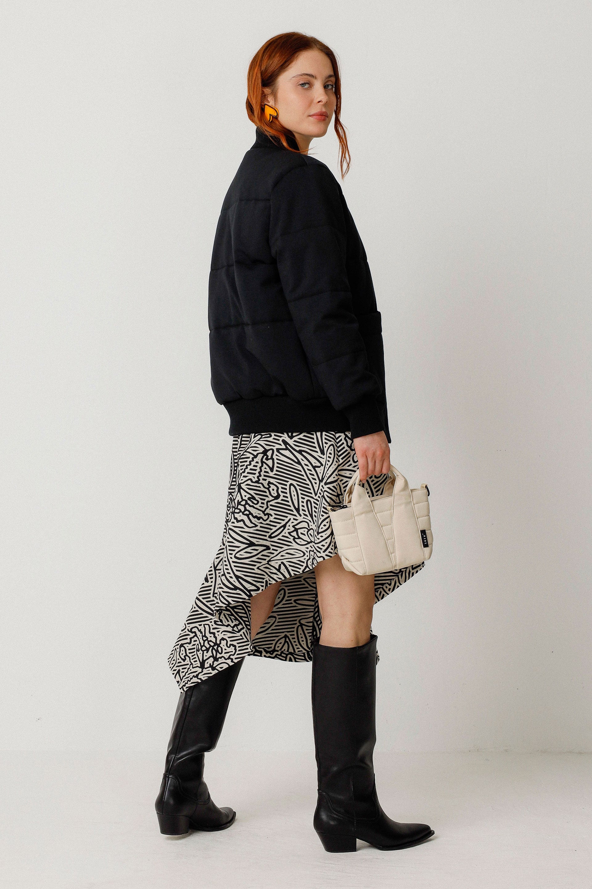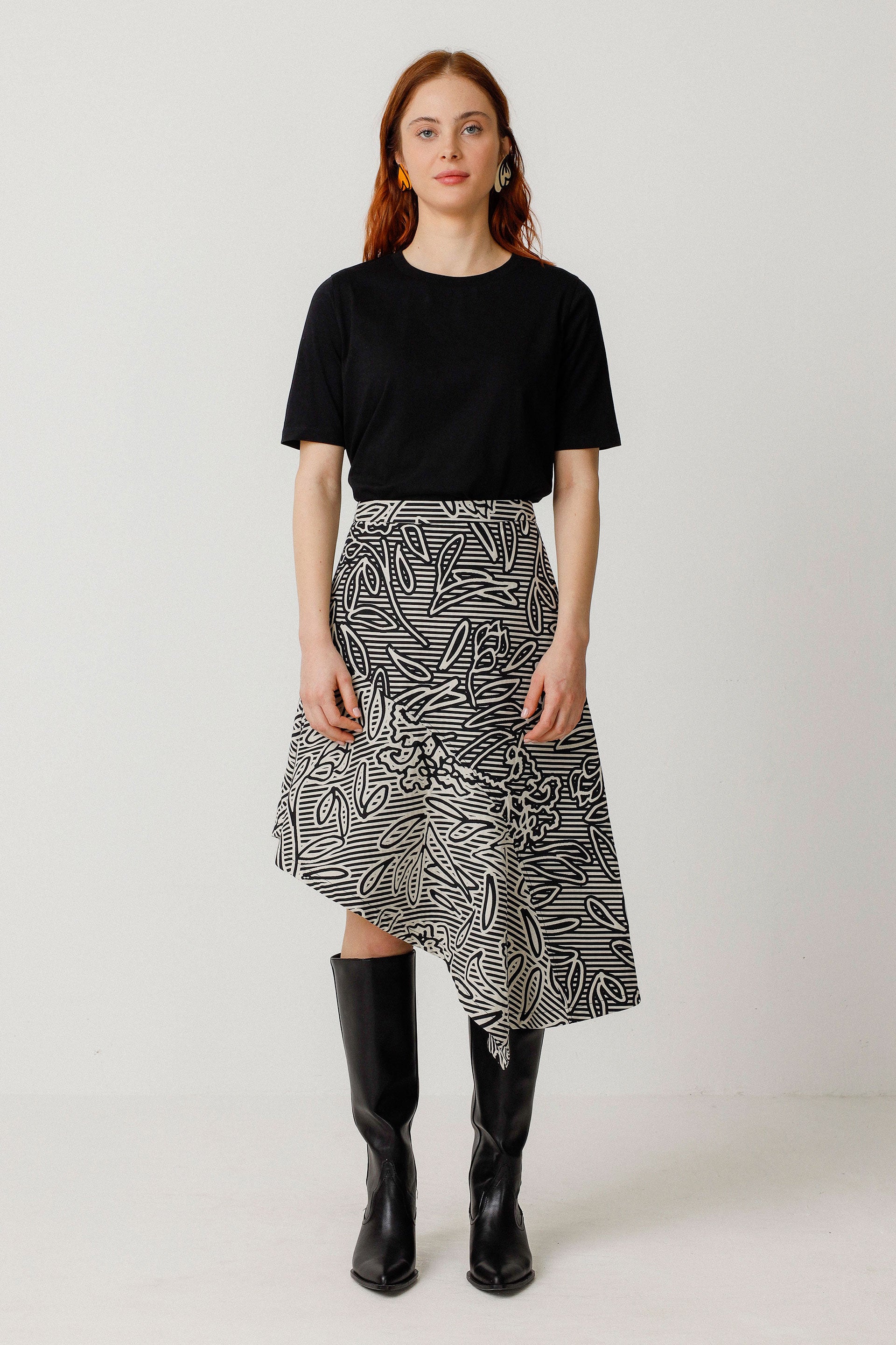 Introducing the Nethe Skirt in black, a stunning creation from SKFK designer. This unique skirt features an asymmetrical hem and a middle seam, adding an edgy and modern touch to a classic black skirt. The style code for this elegant piece is WSK00622. With a back zip for easy wear, the Nethe Skirt is designed with an A-line shape to flatter all body types.