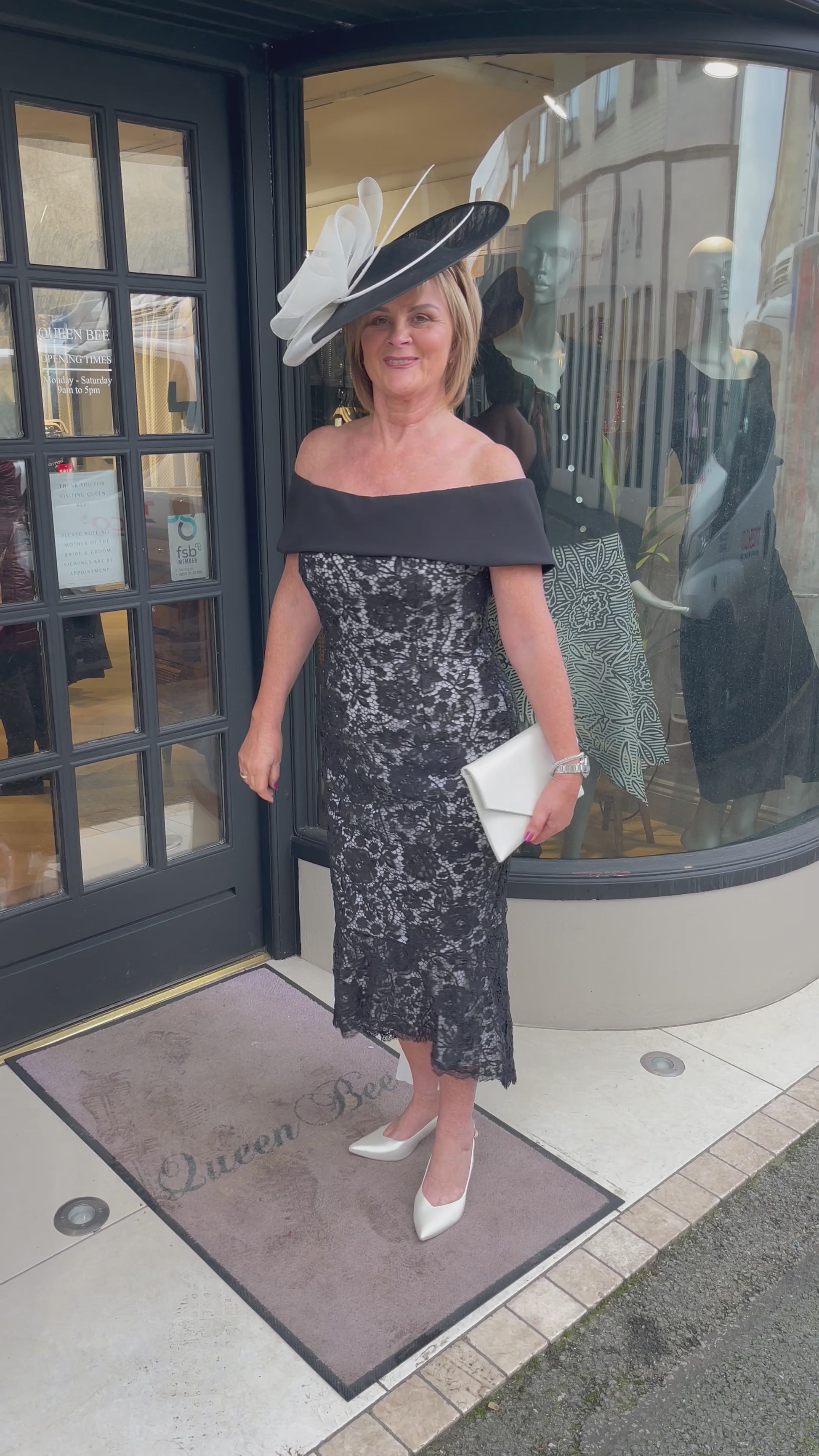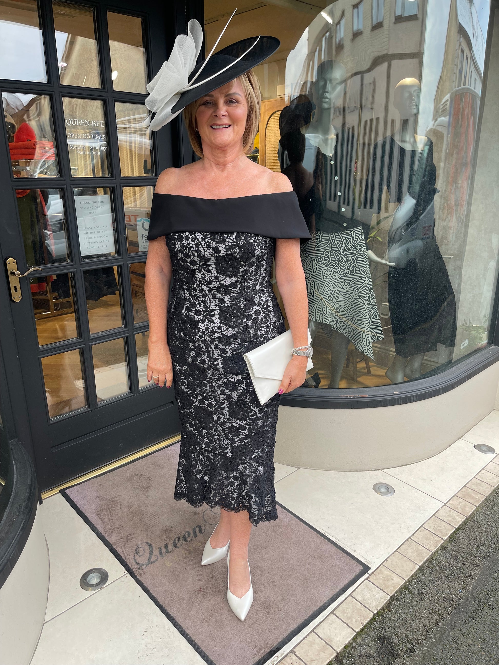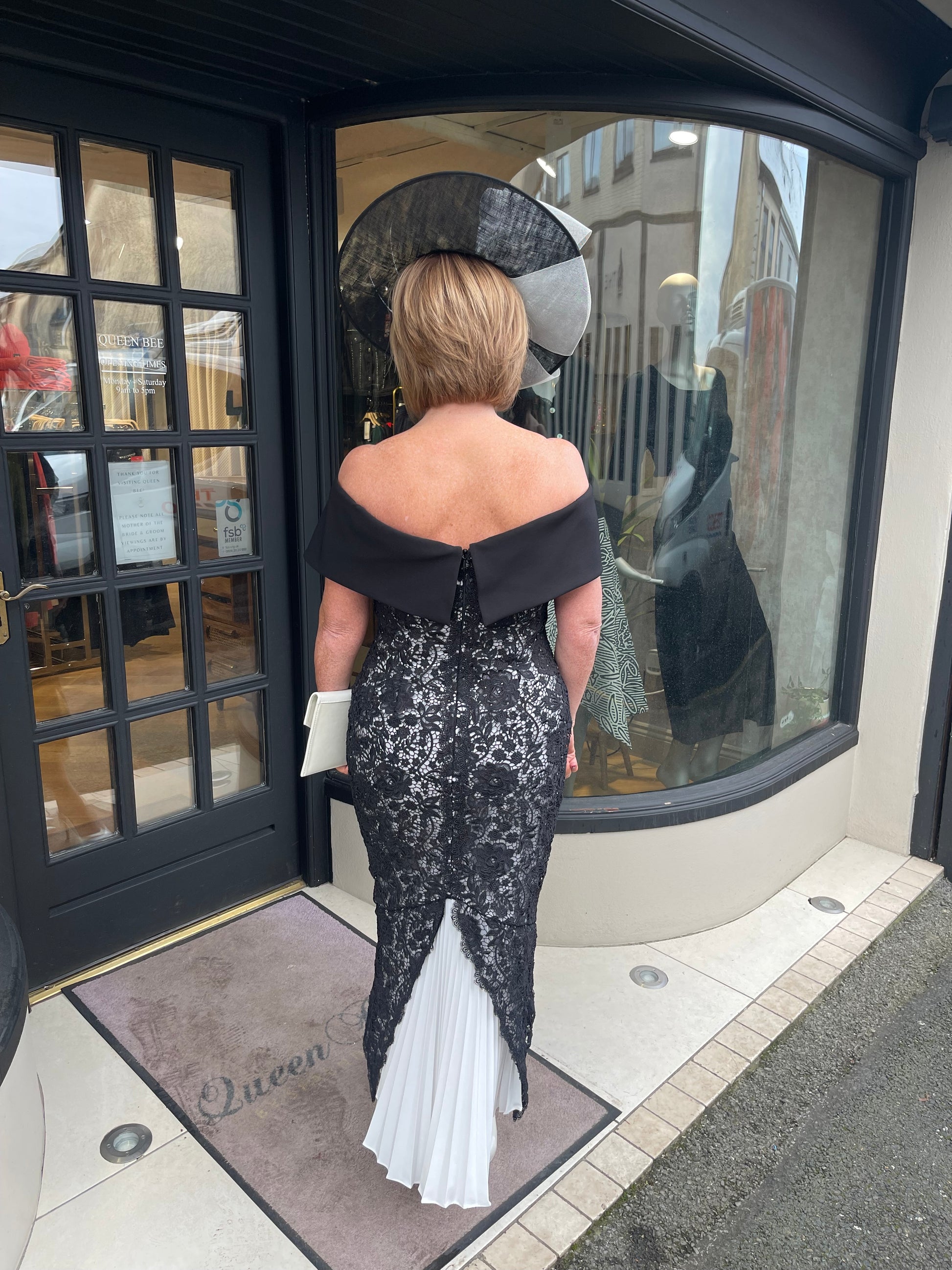For a striking and stunning look, choose Veni Infantino's 992410 Black Lace Ivory Mother of Dress. The off-the-shoulder fishtail shape, with an ivory underlining, features a gorgeous godet pleat train and zipper closure back. Perfect for any mother of the bride or groom. A Fabulous Midi length with a fit and flare shape, thee most stunning shape on and very flattering on all shapes.