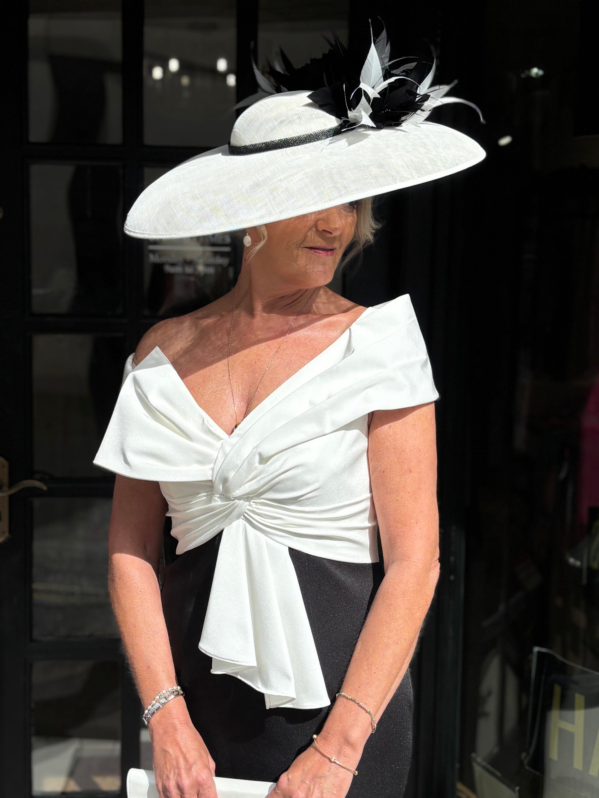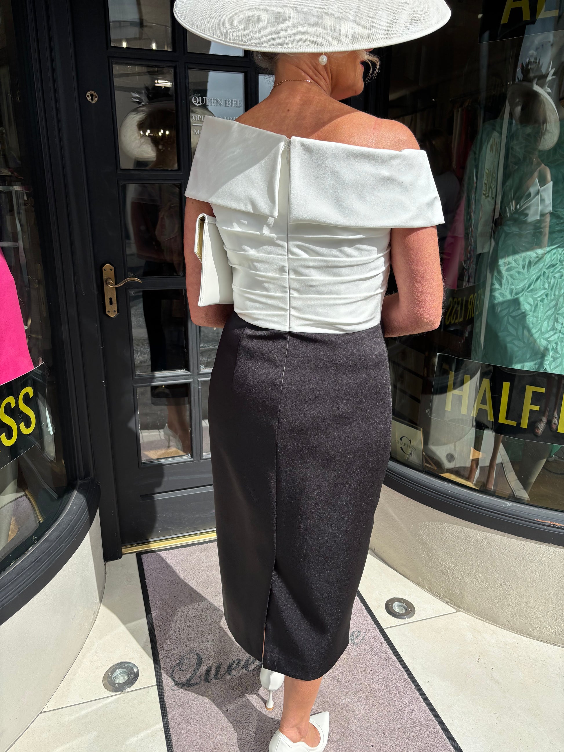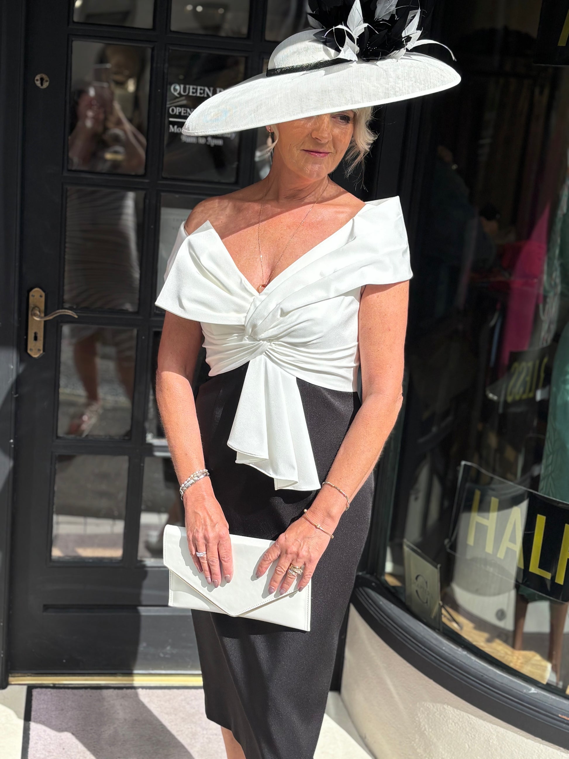 A statement design from Veni Infantino offering an exclusive colour to Queen Bee. The statement Black and Ivory is a perfect complement to a Black Tie Wedding. Style 992551 is a fitted bardot neckline dress with pleating detail on the bodice and a drape under the waist.