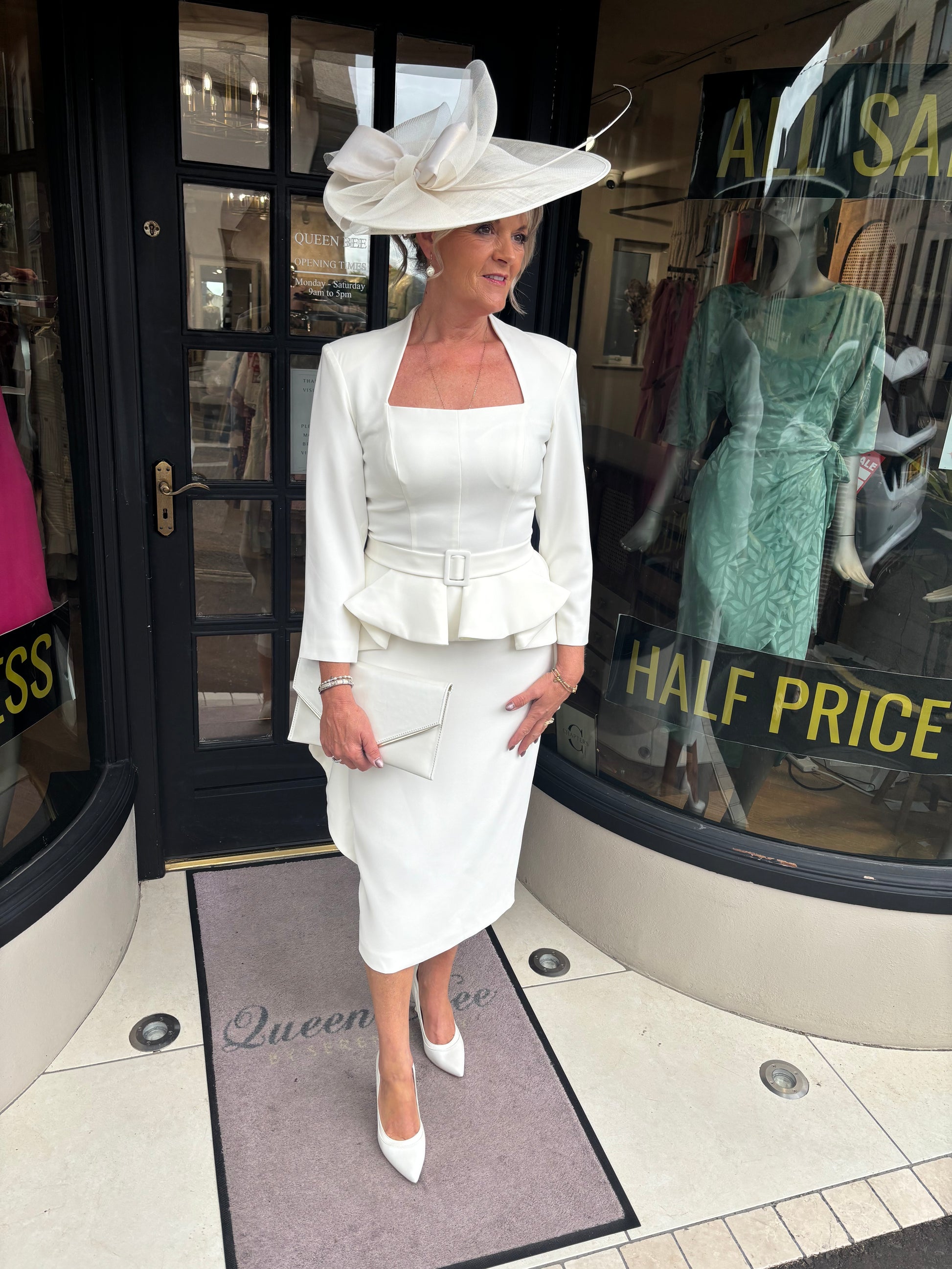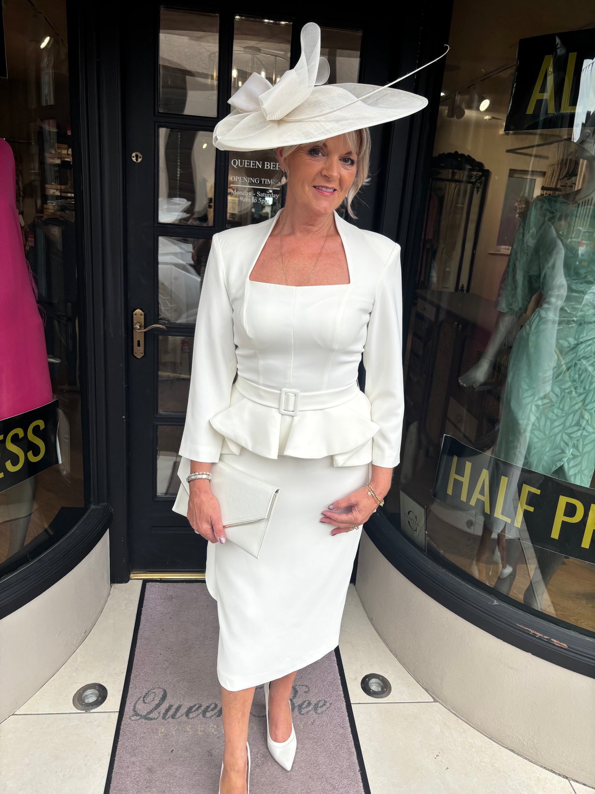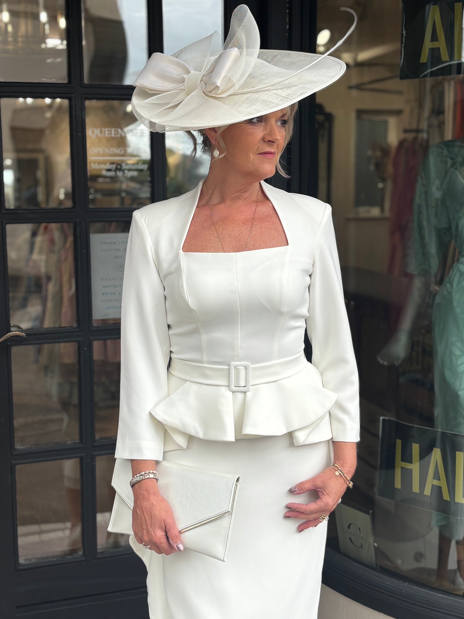 Veni Infantino latest collection of Mother of the Bride and Groom offering a stunning Ivory Peplum Dress with a buckle belt. Fitted skirt and statement square Neckline. 3/4 sleeve. style 992550 has been designed in the Ivory Exclusive to Queen Bee.